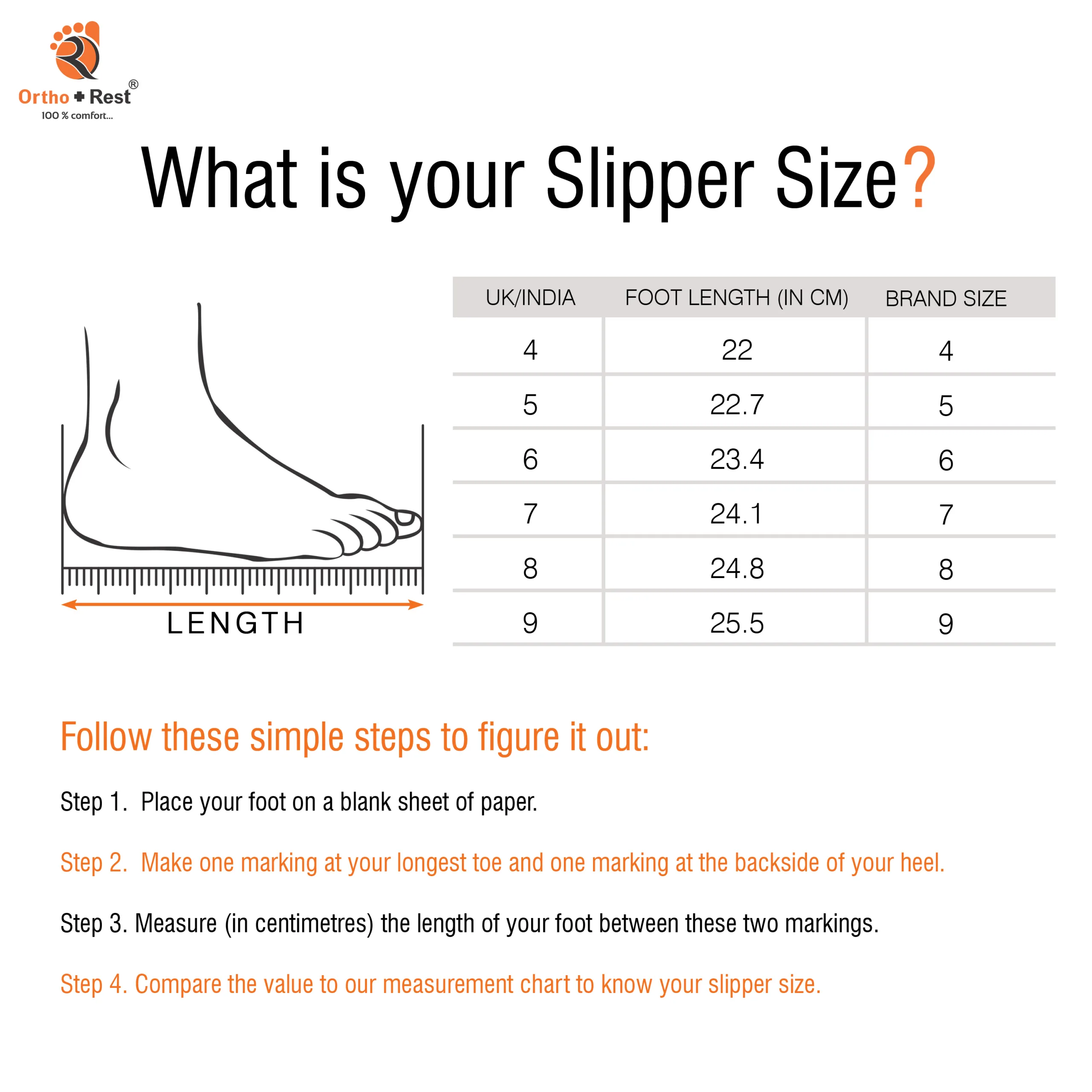 | Brand Size | UK | EURO | USA | Foot Length ( in cm ) | Foot Length ( in inches ) |