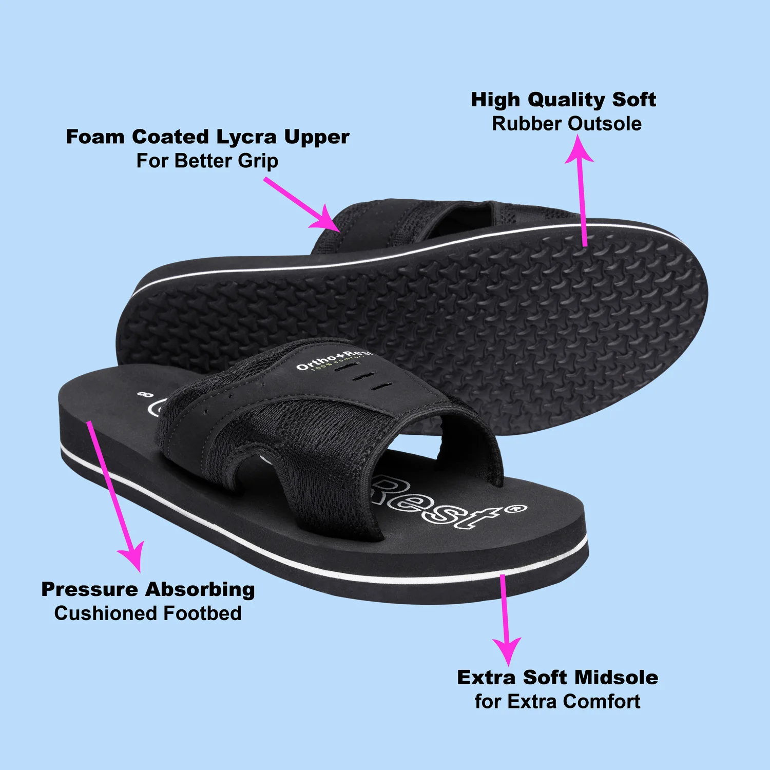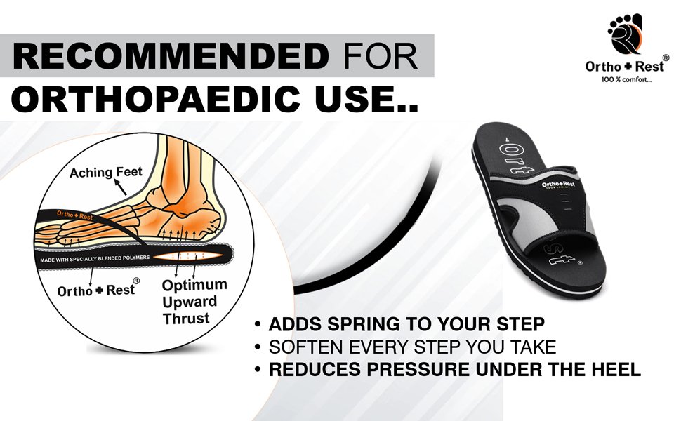 Ortho + Rest slippers and sandals has been engineered from carefully selected and specially blended polymers keeping in mind the requirements of paining heel and foot. It provides that extra yet optimum thrust of cushioning required by an average Indian feet.Â