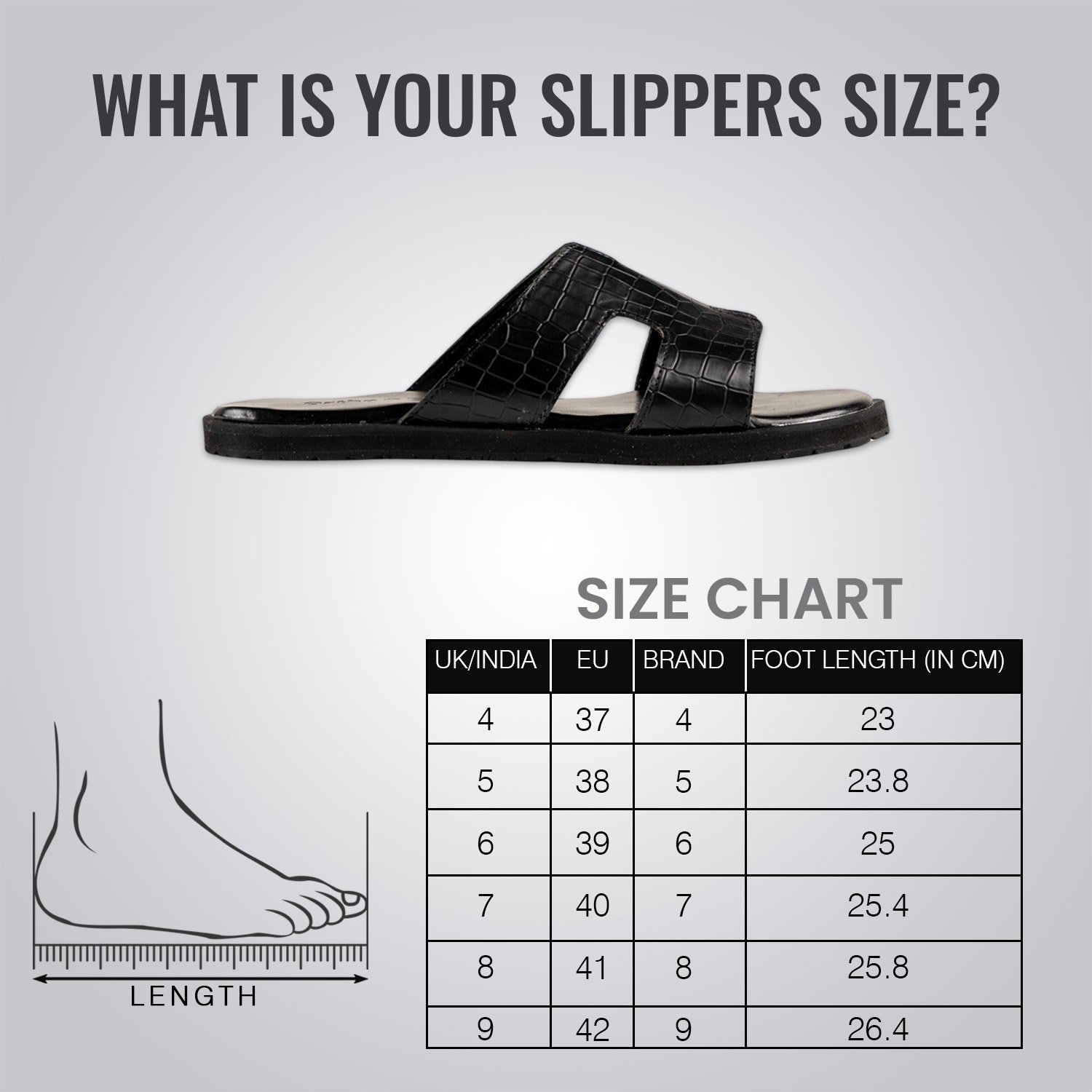 | Brand Size | UK | EURO | USA | Foot Length ( in cm ) | Foot Length ( in inches ) |