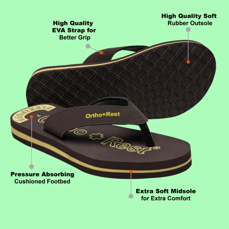 Ortho + Rest slippers and sandals has been engineered from carefully selected and specially blended polymers keeping in mind the requirements of paining heel and foot. It provides that extra yet optimum thrust of cushioning required by an average Indian feet. Ortho + Rest may be effective in many cases. It’s special material provides extra comfort, It is skid and slip resistant and provides symptomatic relief in conditions of aching heel and feet.