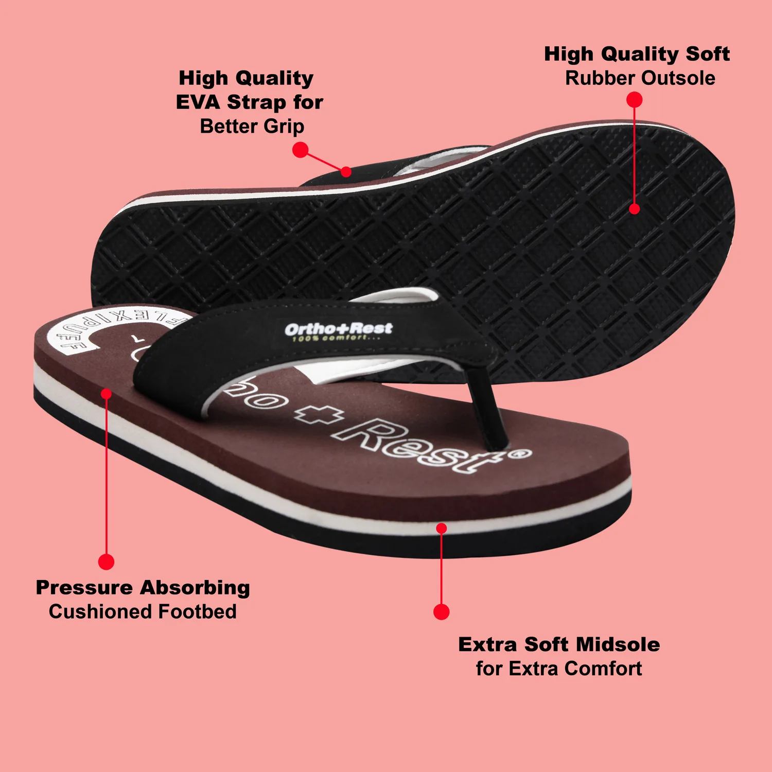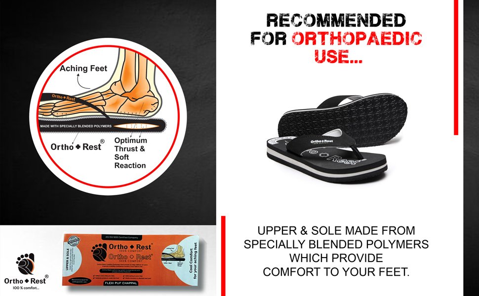 Ortho + Rest slippers and sandals has been engineered from carefully selected and specially blended polymers keeping in mind the requirements of paining heel and foot. It provides that extra yet optimum thrust of cushioning required by an average Indian feet.