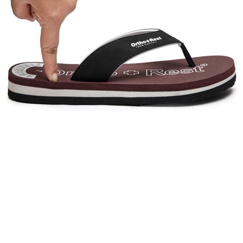 Everyone loves having black footwear and accessories. Adding comfort and style to your looks, our Brown Ortho + Rest Comfort Slippers are perfect for your wardrobe. These proffer optimal convenience and mobility to the wearer while supporting the foot through its thick strap and base.