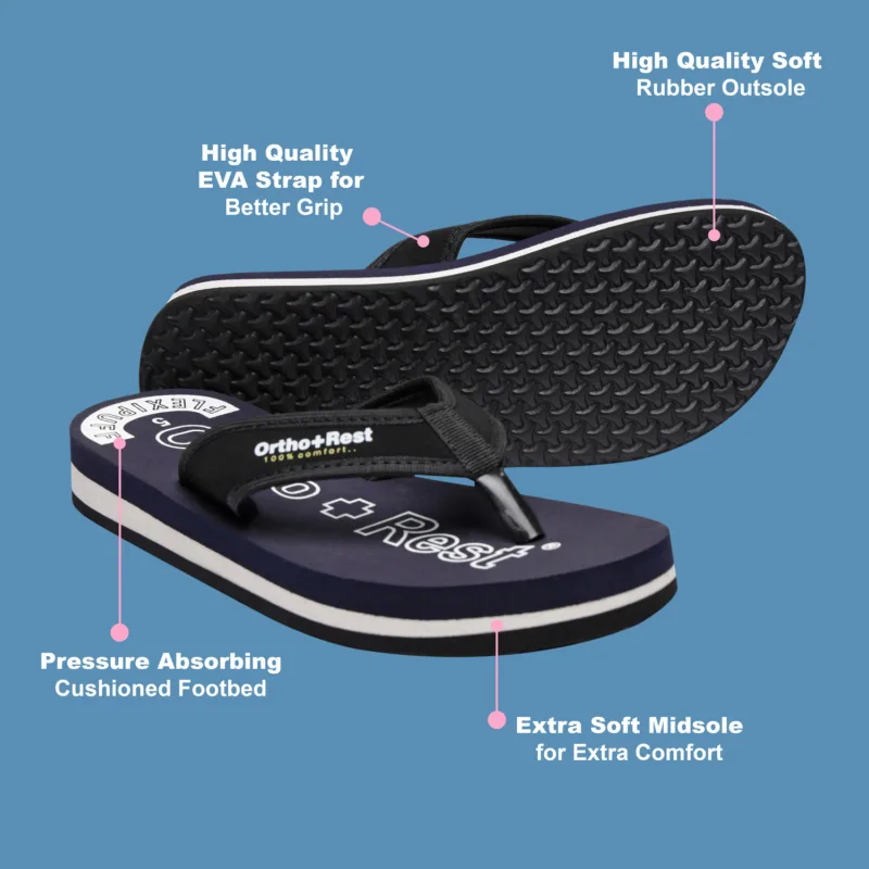 Everyone loves having blue footwear and accessories. Adding comfort and style to your looks, our Blue Ortho + Rest Comfort Slippers are perfect for your wardrobe. These proffer optimal convenience and mobility to the wearer while supporting the foot through its thick strap and base.