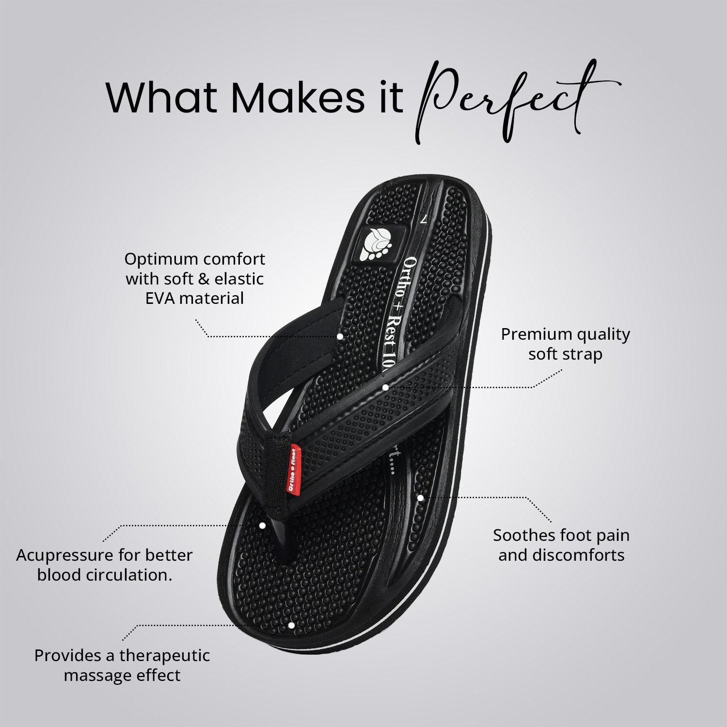 Ortho + Rest slippers and sandals has been engineered from carefully selected and specially blended polymers keeping in mind the requirements of paining heel and foot. It provides that extra yet optimum thrust of cushioning required by an average Indian feet. Ortho + Rest may be effective in many cases. It’s special material provides extra comfort, It is skid and slip resistant and provides symptomatic relief in conditions of aching heel and feet. Being an open footwear it is helpful for diabetics as injuries due to closed,tight fitting and hard soled shoes and prespiration are prevented. As a general footwear its use is strongly recommended to prevent occurance of conditions leading to heel pain and foot pain.
