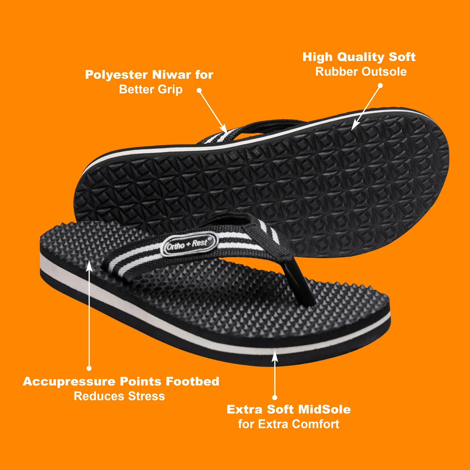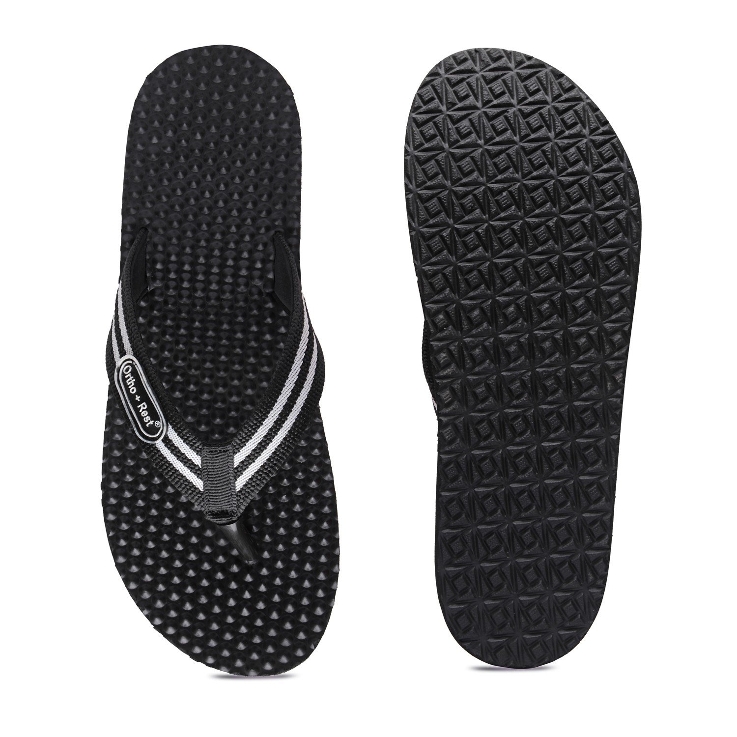 Ortho + Rest slippers and sandals has been engineered from carefully selected and specially blended polymers keeping in mind the requirements of paining heel and foot. It provides that extra yet optimum thrust of cushioning required by an average Indian feet. Ortho + Rest may be effective in many cases. It’s special material provides extra comfort, It is skid and slip resistant and provides symptomatic relief in conditions of aching heel and feet. Being an open footwear it is helpful for diabetics as injuries due to closed,tight fitting and hard soled shoes and prespiration are prevented. As a general footwear its use is strongly recommended to prevent occurance of conditions leading to heel pain and foot pain.