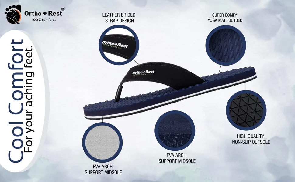 Ortho + Rest slippers and sandals has been engineered from carefully selected and specially blended polymers keeping in mind the requirements of paining heel and foot. It provides that extra yet optimum thrust of cushioning required by an average Indian feet. Ortho + Rest may be effective in many cases. It’s special material provides extra comfort, It is skid and slip resistant and provides symptomatic relief in conditions of aching heel and feet.