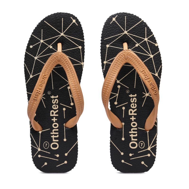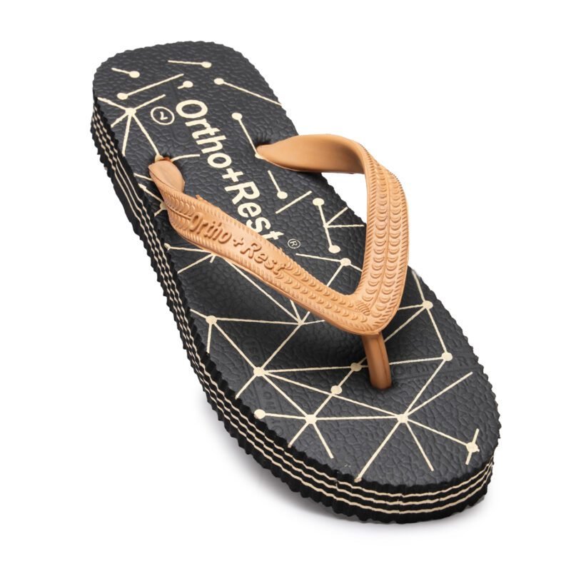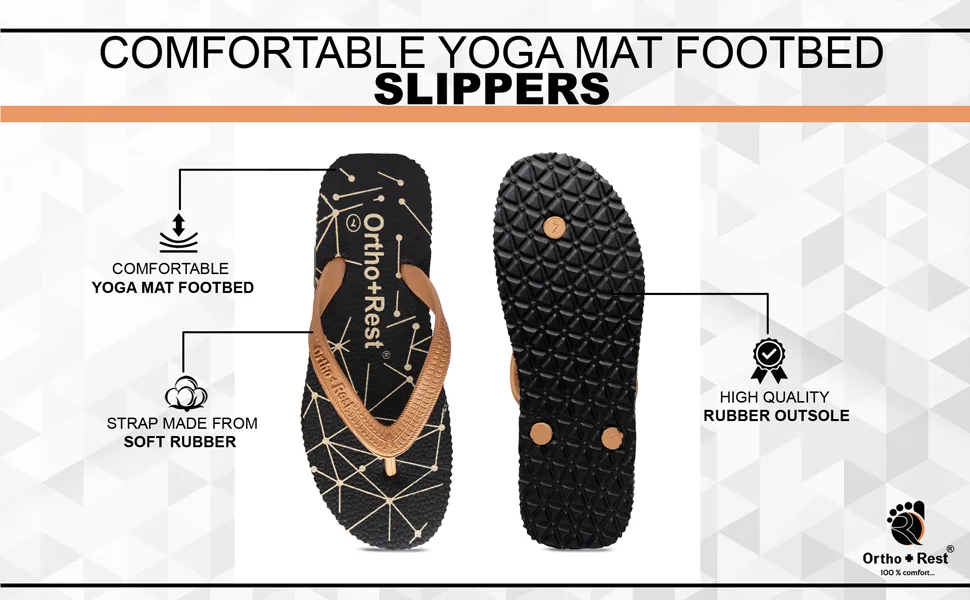 Everyone loves having black footwear and accessories. Adding comfort and style to your looks, our Black Ortho + Rest Comfort Slippers are perfect for your wardrobe. These proffer optimal convenience and mobility to the wearer while supporting the foot through its thick strap and base.