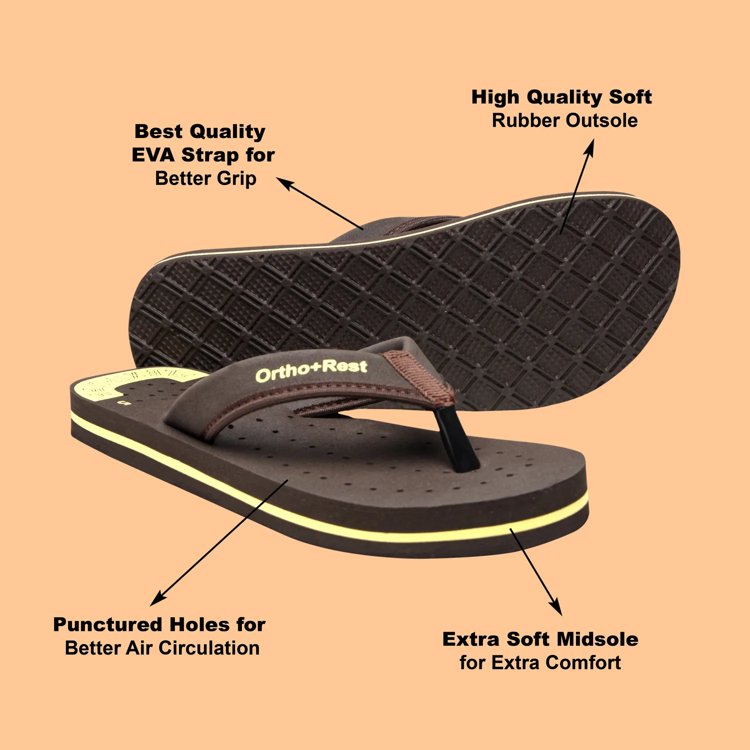 Ortho + Rest slippers and sandals has been engineered from carefully selected and specially blended polymers keeping in mind the requirements of paining heel and foot. It provides that extra yet optimum thrust of cushioning required by an average Indian feet. Ortho + Rest may be effective in many cases. It’s special material provides extra comfort, It is skid and slip resistant and provides symptomatic relief in conditions of aching heel and feet.