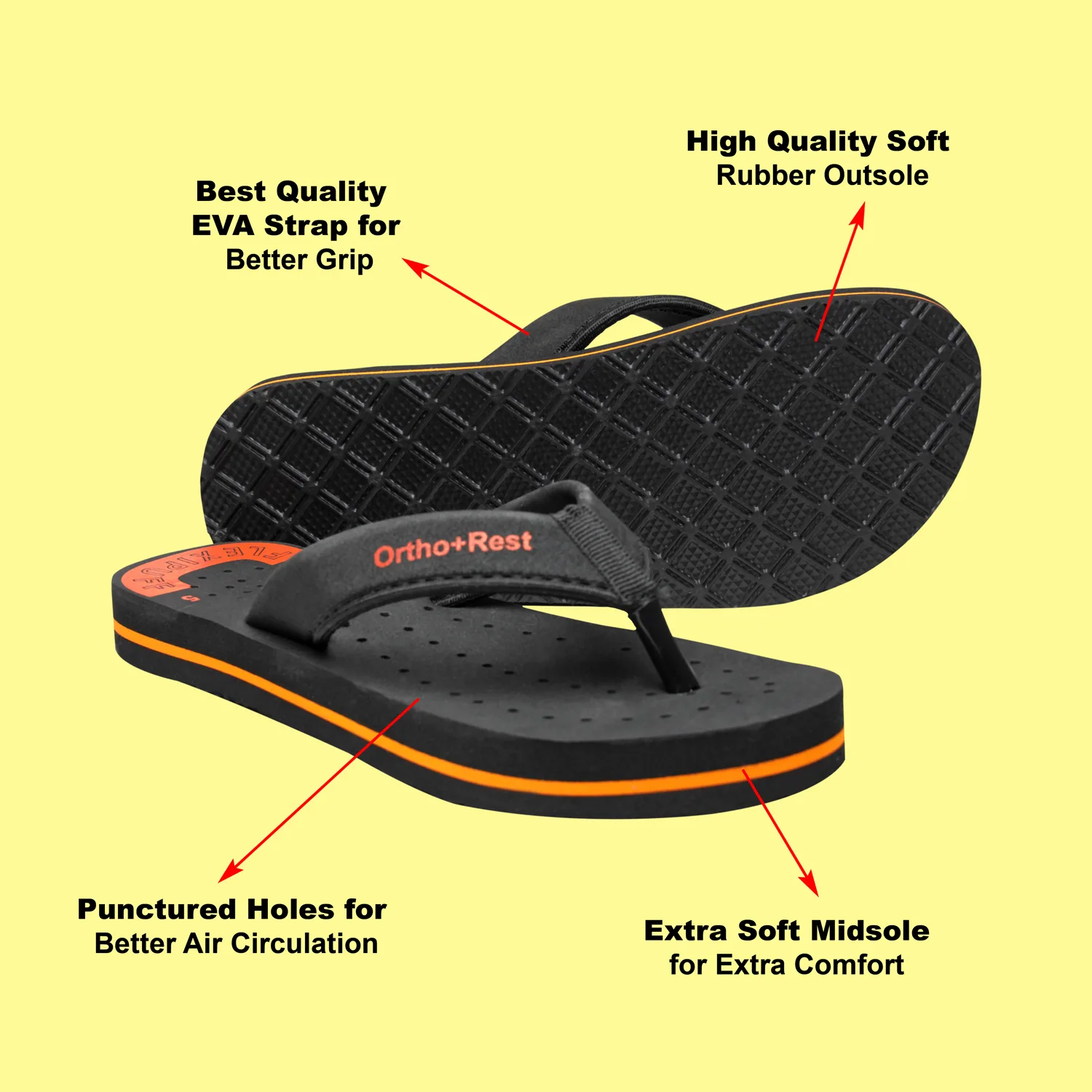 Everyone loves having black footwear and accessories. Adding comfort and style to your looks, our Black Ortho + Rest Comfort Slippers are perfect for your wardrobe. These proffer optimal convenience and mobility to the wearer while supporting the foot through its thick strap and base.