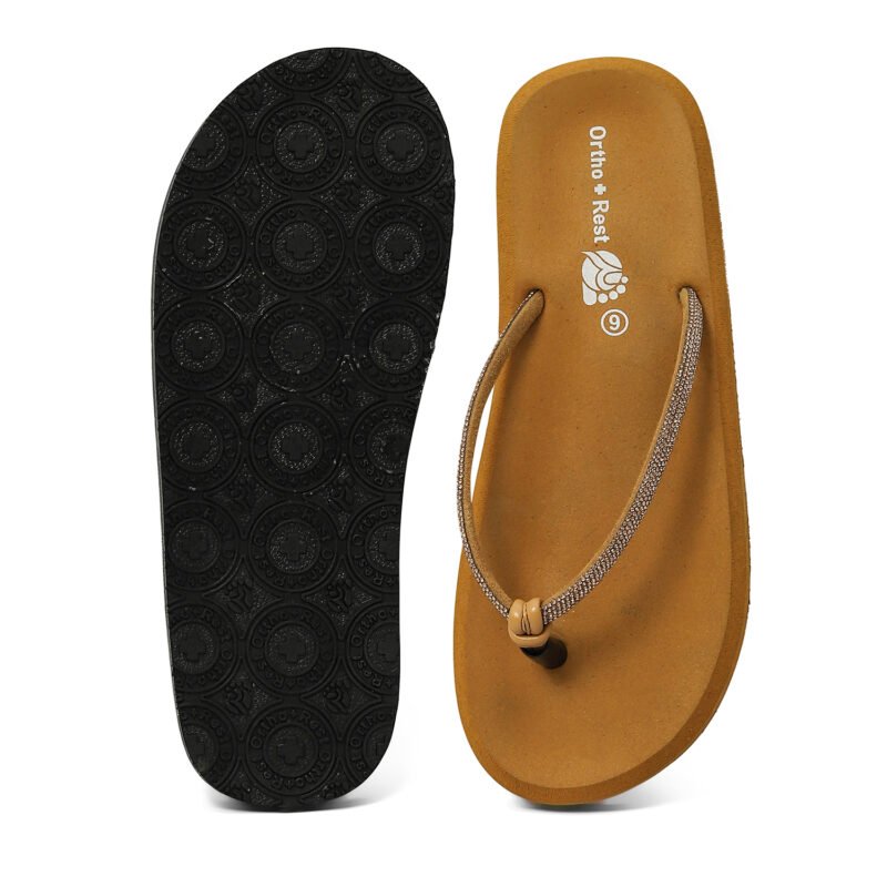 Experience all-day comfort and style with Ortho + Rest Women’s Orthopedic Slippers. Designed with a soft cushioned footbed, these doctor-recommended flip-flops help reduce pressure on heels and joints, making them perfect for daily use. The elegant strap design with a hint of sparkle adds a fashionable touch, while the lightweight and durable sole ensures long-lasting wear. Ideal for both indoor and outdoor use, these versatile chappals pair effortlessly with ethnic and casual outfits. Whether you’re at home, running errands, or stepping out casually, enjoy the perfect blend of comfort and elegance with these orthopedic slippers made for modern women